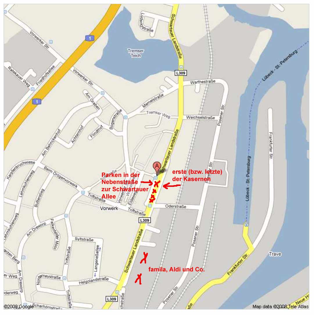 An folgenden Orten gebe ich Unterricht; für die Musik- und Kunstschule: Kalandschule ansonsten: Dr.-Julius-Leber-Straße 53, 23552 Lübeck und Kaserne der Musikhochschule in der Schwartauer Landstraße gegenüber von Famila. (Aus Lübeck kommend die letzte der etwa fünf Kasernen, aus Schwartau kommend die erste) Parken kann man am besten in der Nebenstraße zur Schwartauer Allee. Die genaue Adresse lautet: Peenestieg 1-3, D-23554 Lübeck, vielleicht hilft diese Skizze weiter: